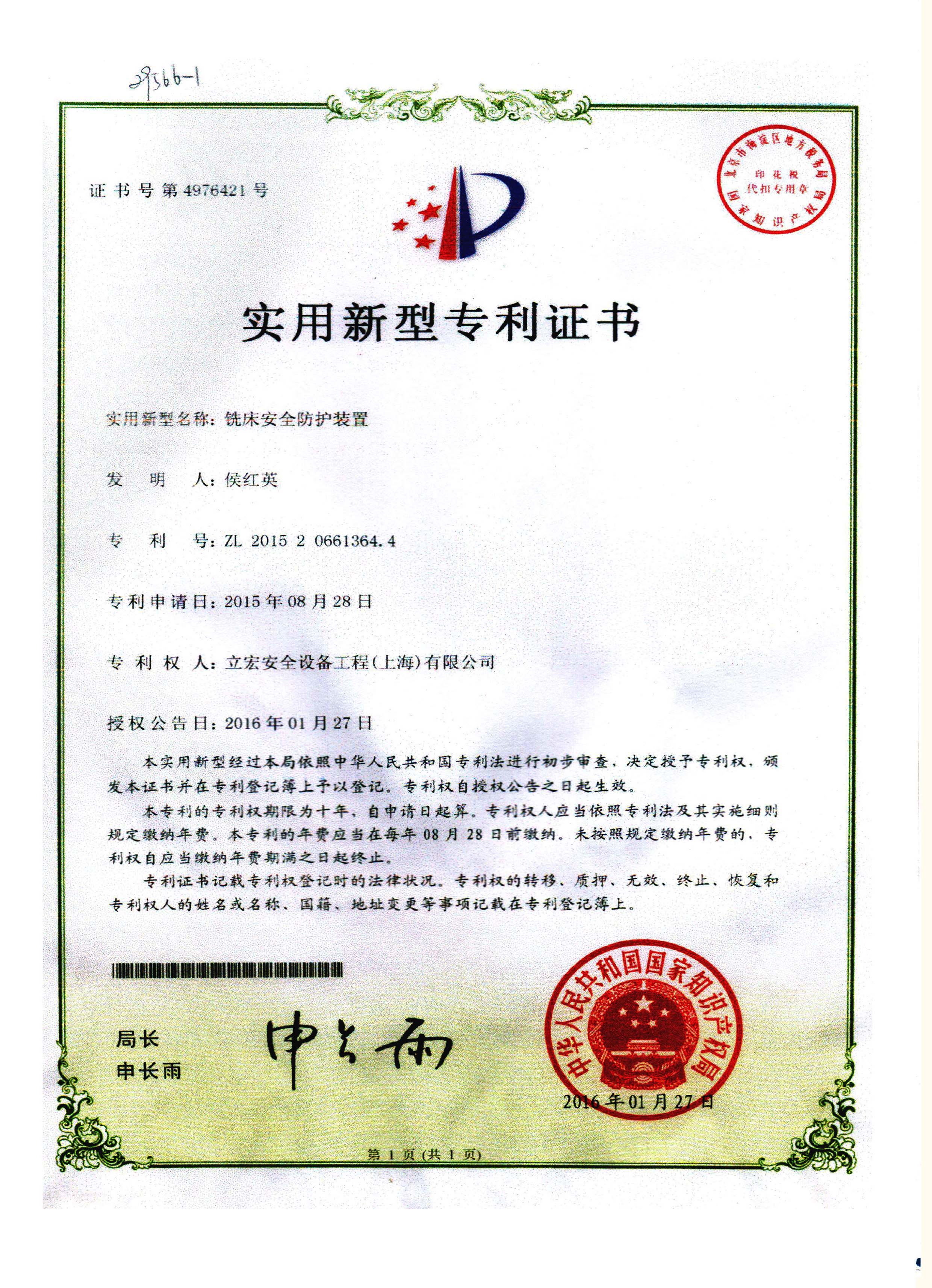 實(shí)用新型名稱(chēng):銑床安全防護(hù)裝置專(zhuān)利號(hào):ZL2015 20661364.4