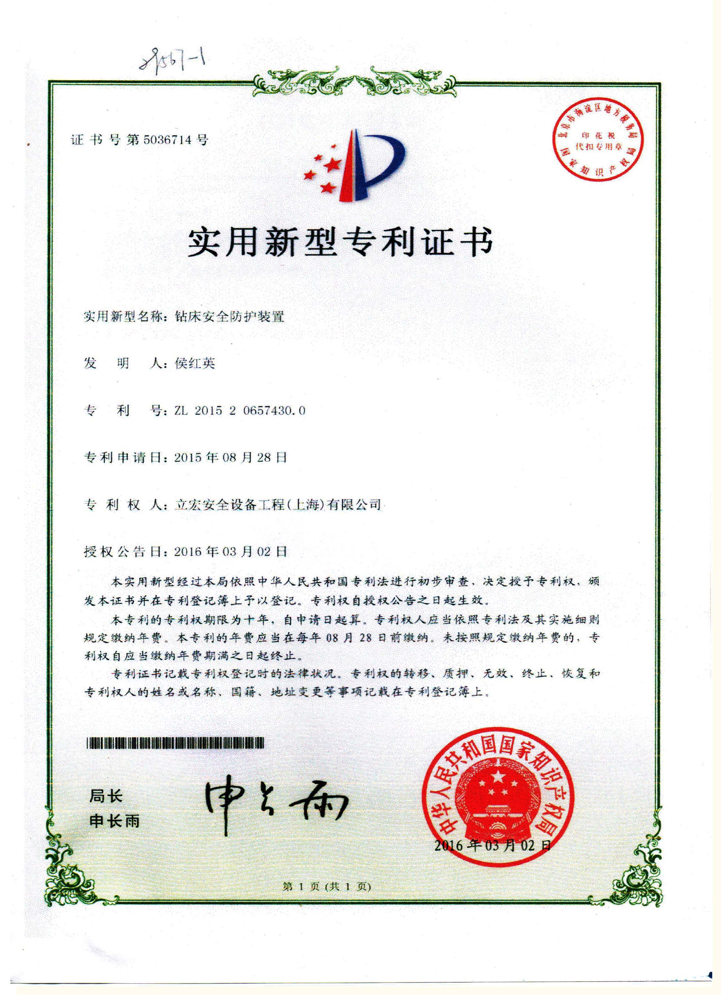 實(shí)用新型名稱(chēng):鉆床安全防護(hù)裝置專(zhuān)利號(hào):ZL 2015 2 0657430.0
