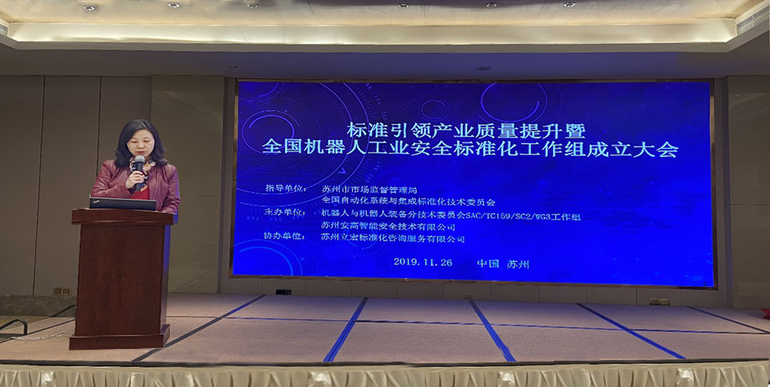 會議主題標準引領產業質量提升暨全國機器人工業安全標準化工作組成立大會,大會由蘇州市市場監督管理局標準管理處副處長楊晶晶主持。蘇州安高智能科技有限公司作為工作組組長單位
